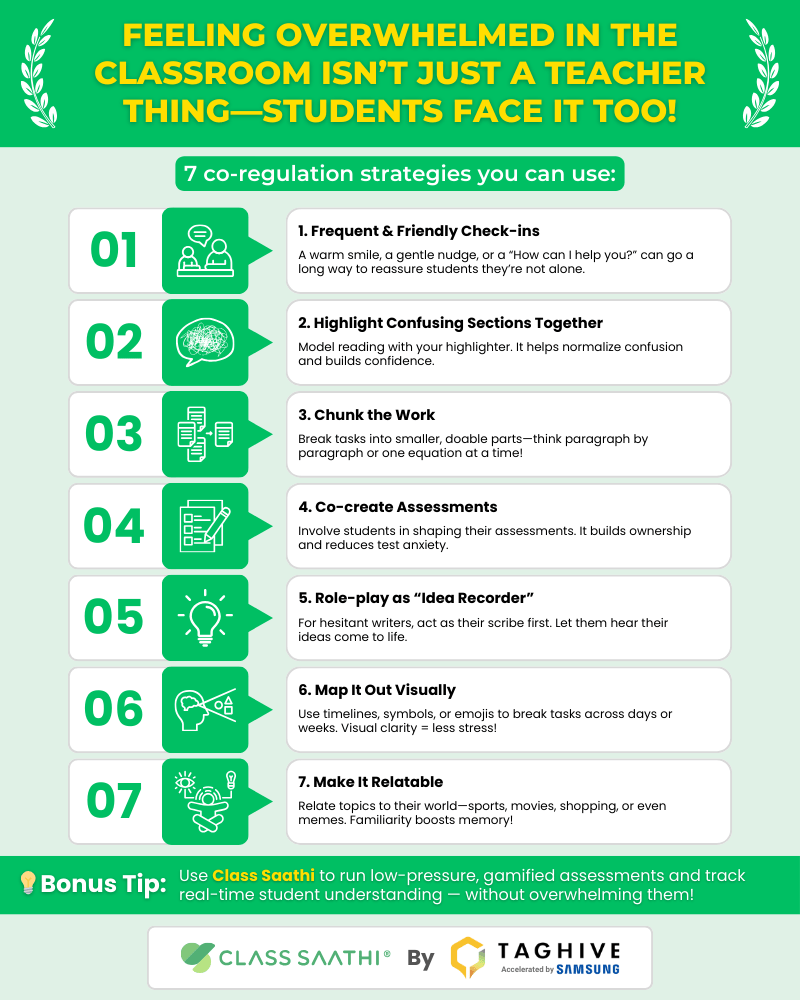 But don’t worry—small changes in your teaching approach can make a big difference. These 7 co-regulation strategies are easy to implement and help students feel safe, supported, and ready to learn. And with Class Saathi, you can make this process even more effective and fun!
