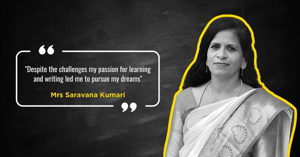 Mrs. Saravana Kumari: My science teacher was my inspiration. Even after marriage, I had a desire to learn and write. Eventually, with my husband's support, I pursued my B.Ed. I specialize in science.